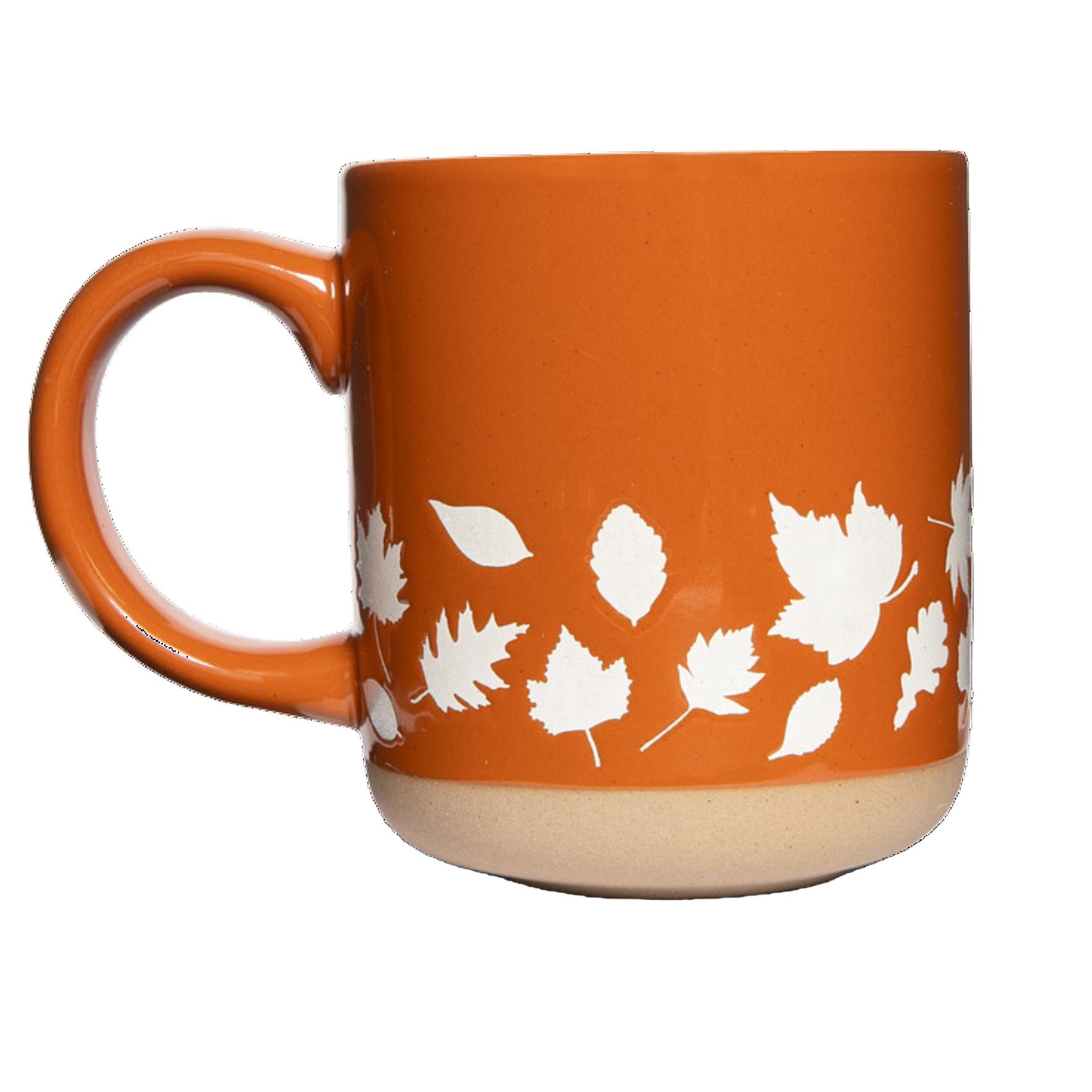 A 14oz stoneware mug covered in a scattered fall leaf pattern. Burnt orange glaze with natural speckles and an exposed clay bottom—the kind of mug that feels like October in your hands.