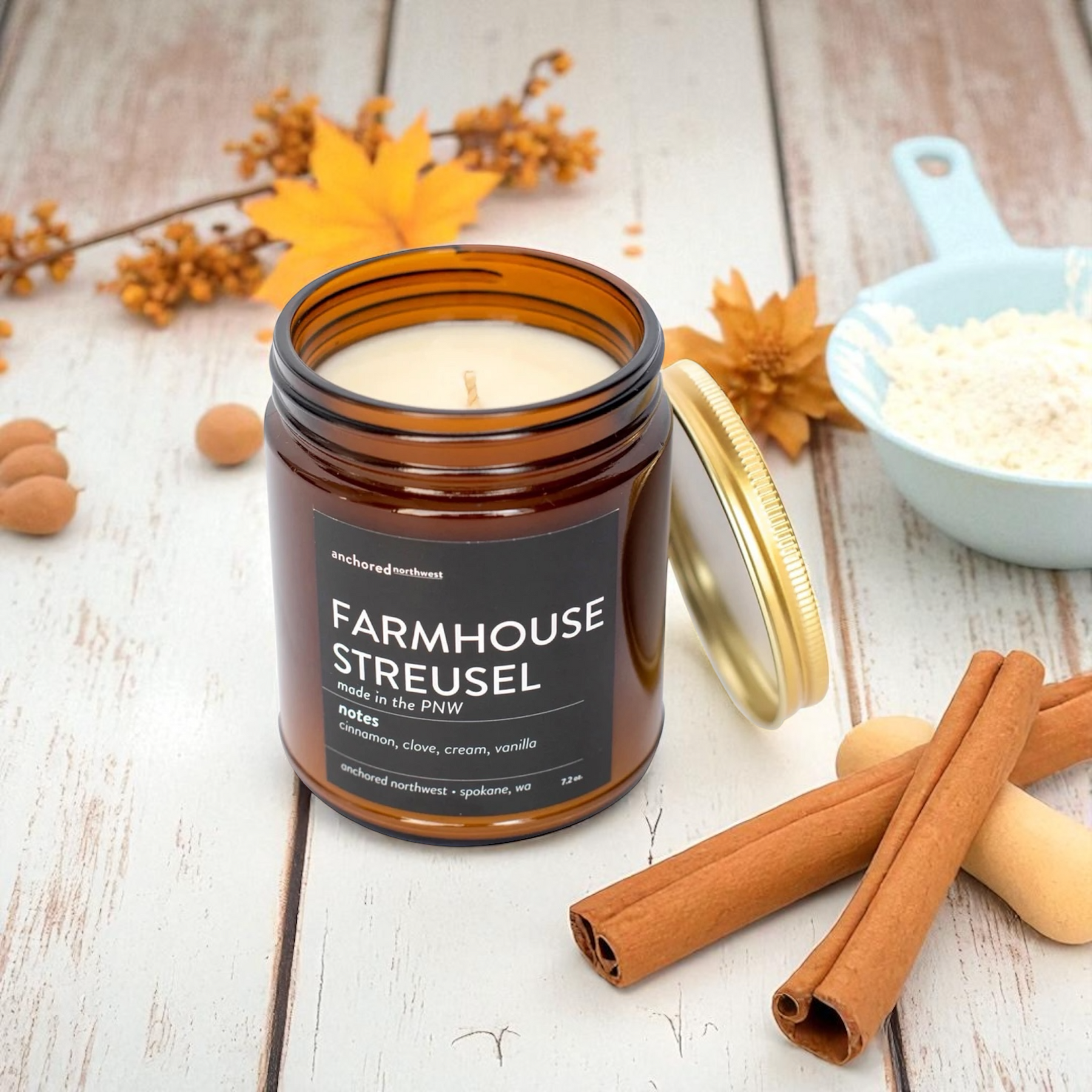 The scent of cinnamon streusel baking in a farmhouse kitchen. Warm cinnamon and clove meet sweet cream and vanilla—comforting without being cloying.