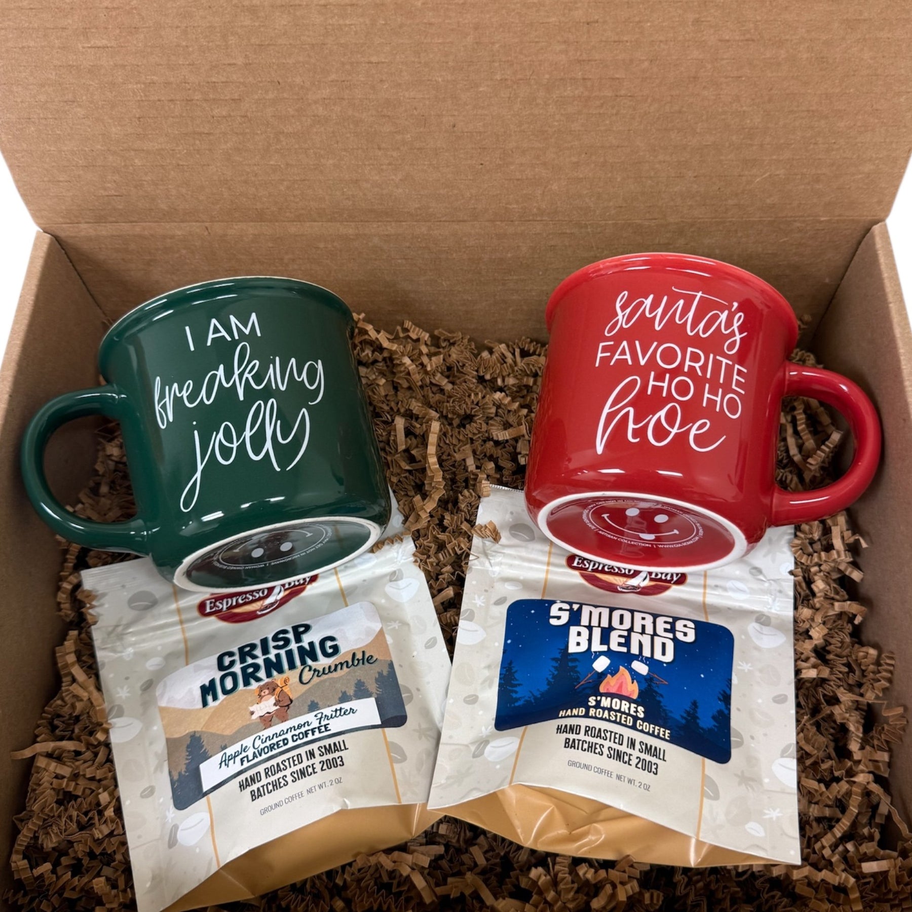 Two holiday mugs with personality, two coffee packets to fuel the festivities. This is the set for when you need caffeine and a little holiday cheer in equal measure.