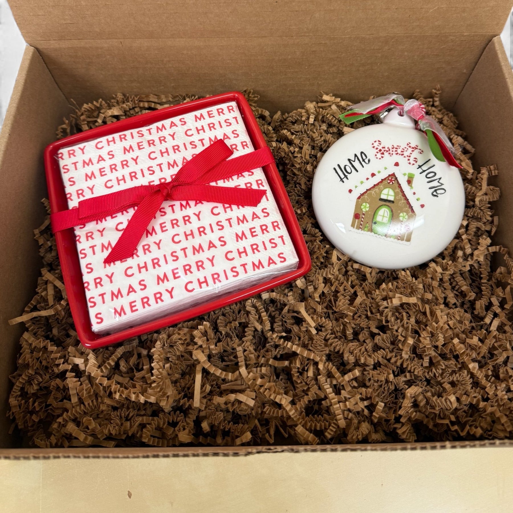 The napkin tray comes filled with festive napkins and sits on your counter or table looking put-together. Choose your favorite ornament design to hang on the tree now, then save it for next year (or give it as a bonus gift tied to a bottle of wine).