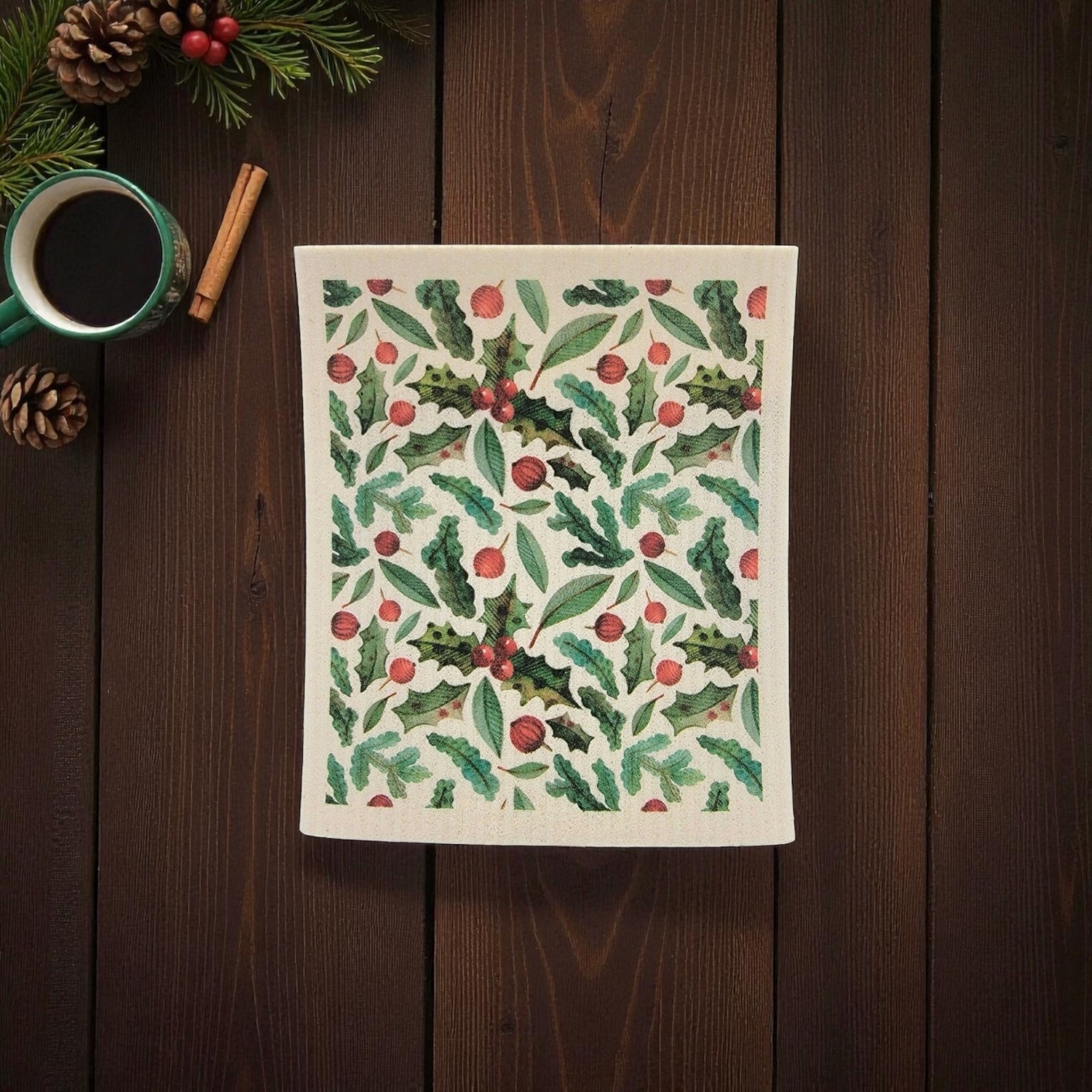 Holly & Berries Swedish Dish Cloth - Reusable Kitchen Towel - Holiday Cleaning Cloth