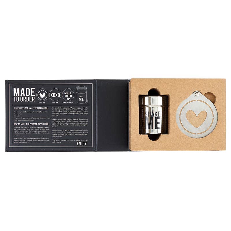 Set includes: Coffee stencils + powder shaker in decorative book box